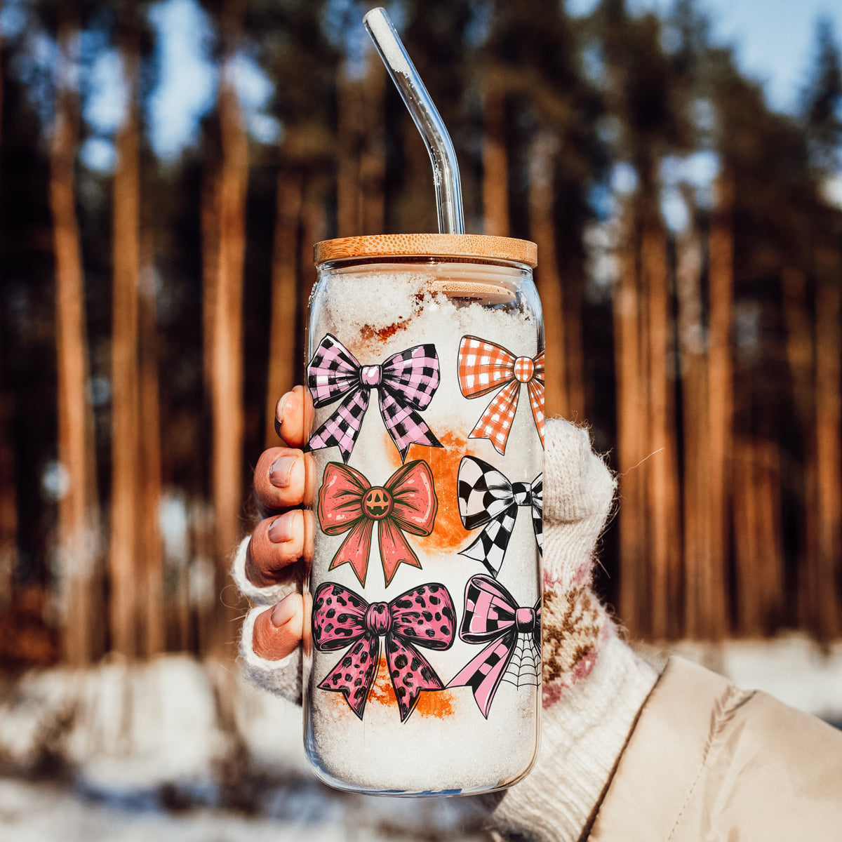 Featuring a parade of perfectly imperfect bows in gingham, leopard, and checkered patterns, this 20oz glass beauty is basically what would happen if cottagecore and fall had a totally aesthetic baby. Think pink and orange hues that scream "I'm cute, but I might ghost you if you don't bring me coffee" energy!